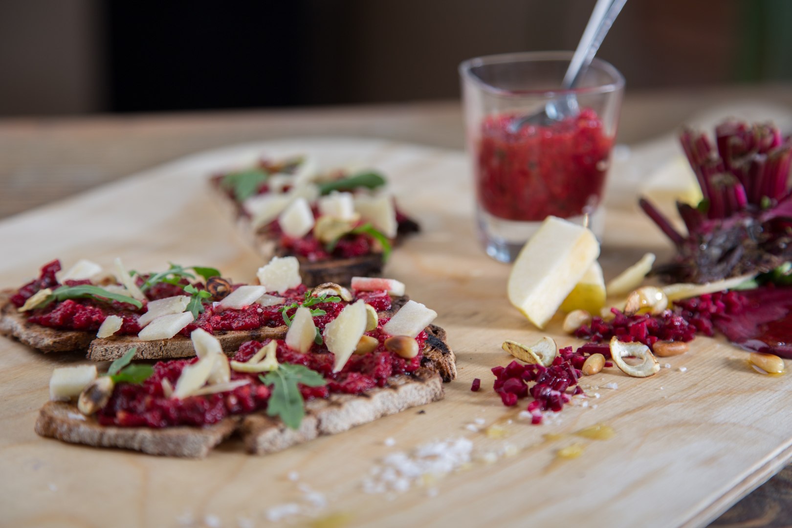 Crostini dünn mit Olivenöl bestrichene Bauerbrot-Scheiben sind in Italien eine beliebte Vorspeise. Dieses Rezept der Tafelkünstler Kochschule Berlin wird mit einem leckeren Rote-Bete-Pesto verfeinert und ist eine interessante Alternative zu herkömmlichen Suppen und Salaten.  Dieses Rezept wird auf der eat&STYLE in Berlin zubereitet.